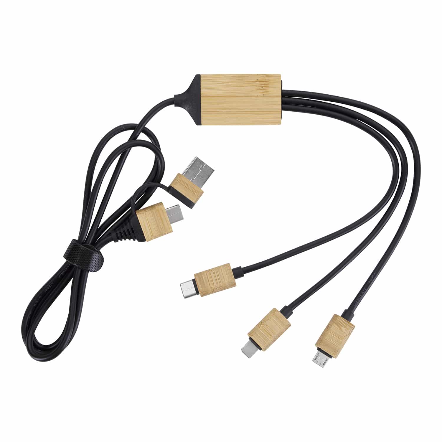 BambooTunes 5-in-1 Charging Cable features dual USB-A and Type-C inputs with a maximum output of 2A. 1″ Diameter x 1.5625″ H